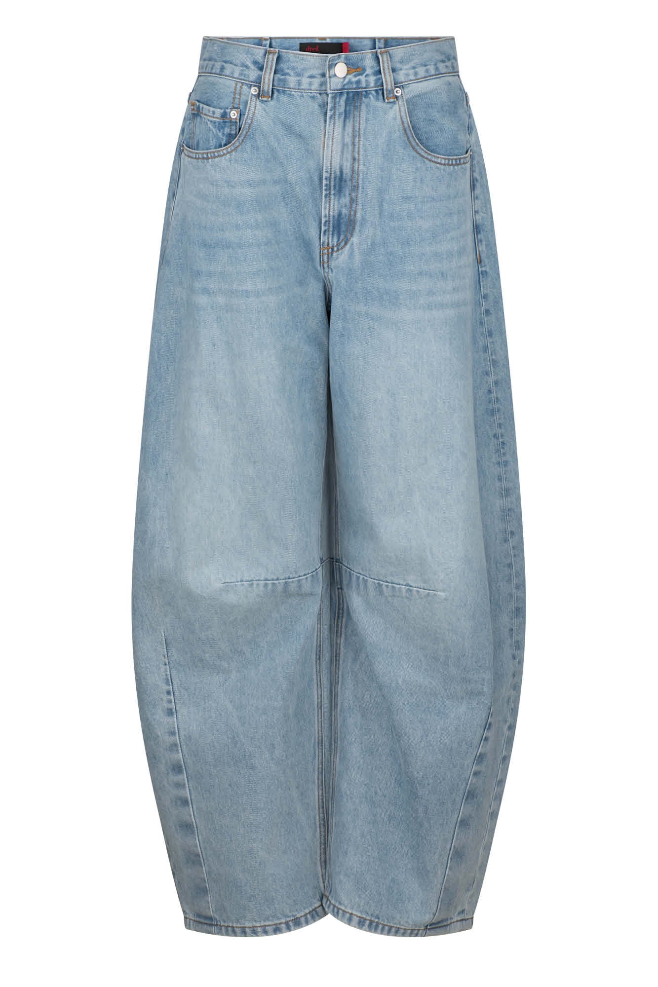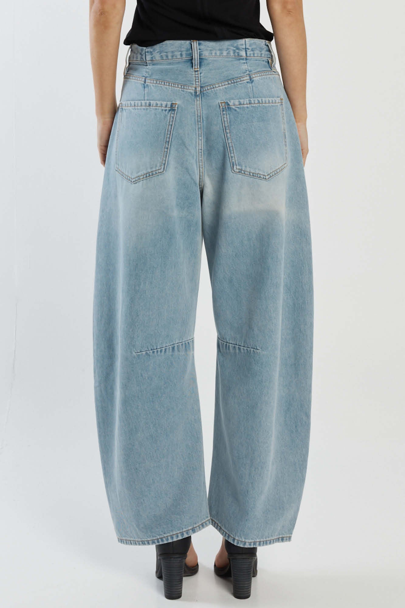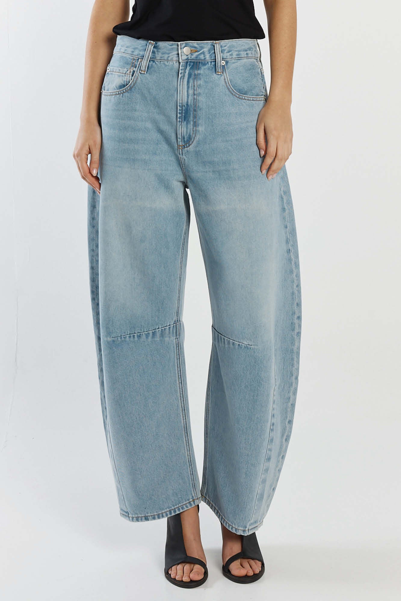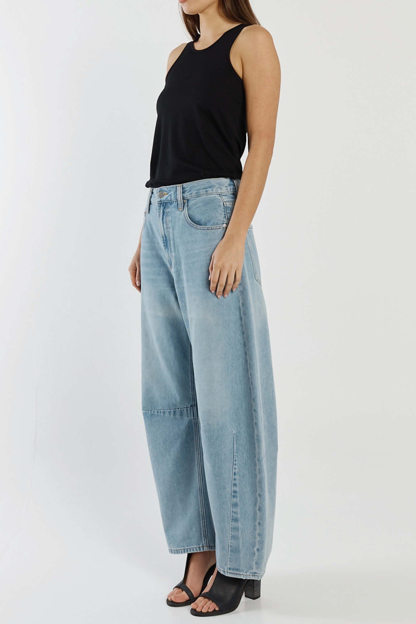 The Barrel Jean is designed with a high rise waist and relaxed barrel leg.
