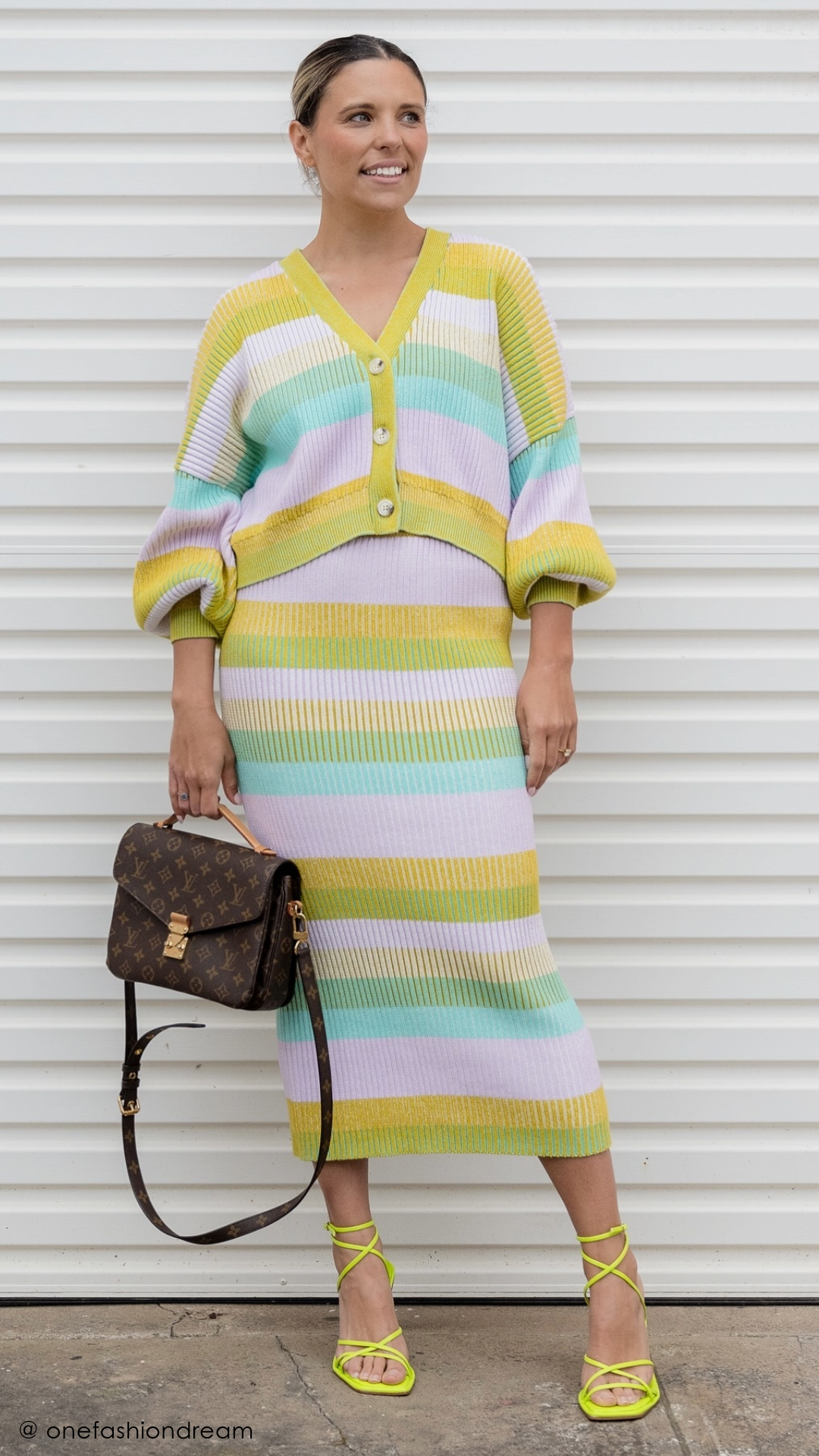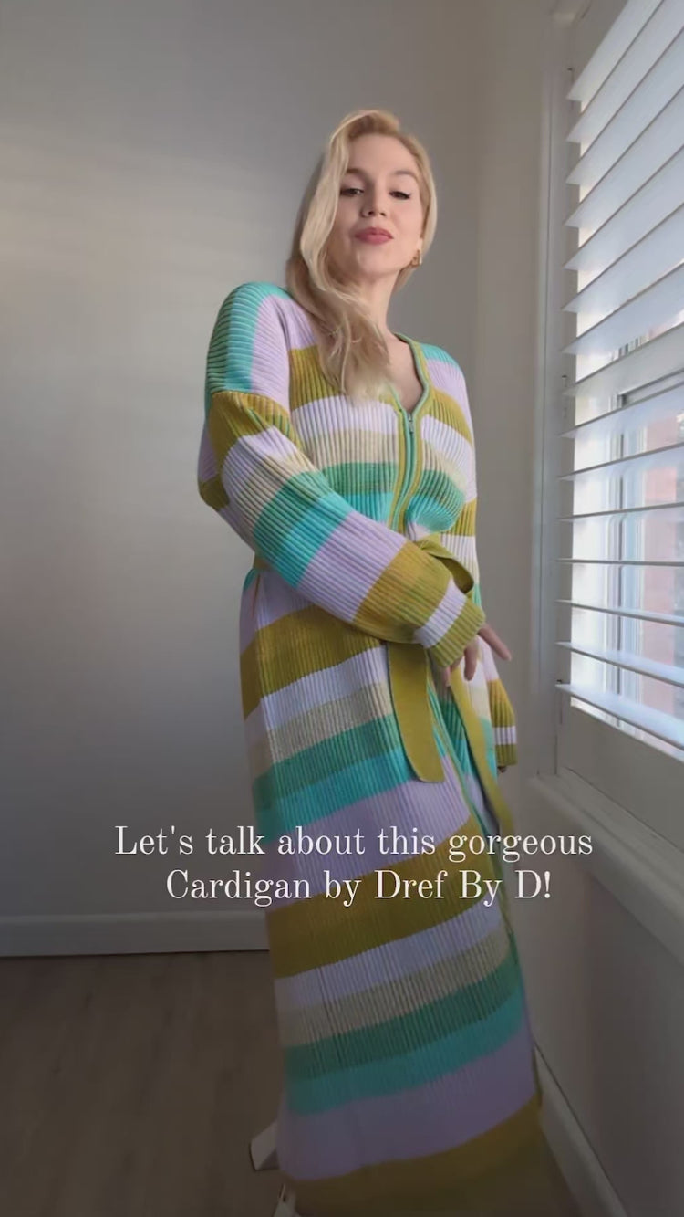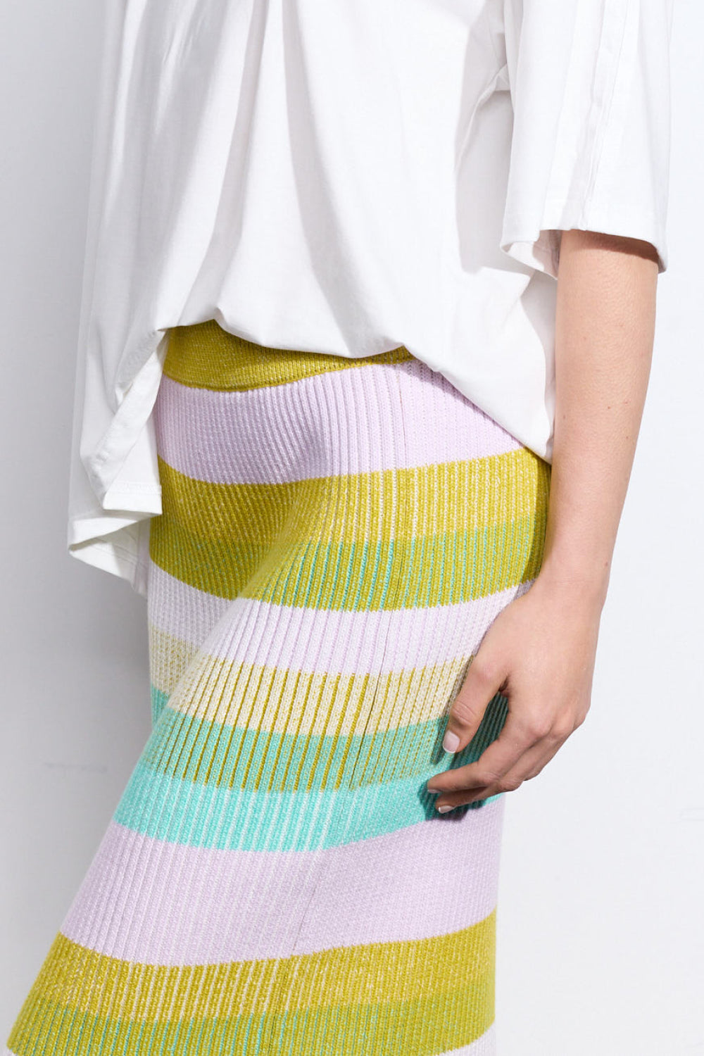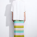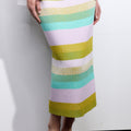 This season is all about bold colour and the Rosette Skirt is no exception. Made from a brioche ribbed stretch-knit for a close fit, it has a streamlined pencil silhouette that sits high on the waist to enhance the classic appeal while the horizontal stripes in rainbow hues will perfectly enhance sun-kissed skin. With an elasticated waist and finishing at a midi hem length, this skirt is a lesson in pared back cool. Coordinate yours effortlessly with the Eclair Maxi Cardi or Gelato Cardi.