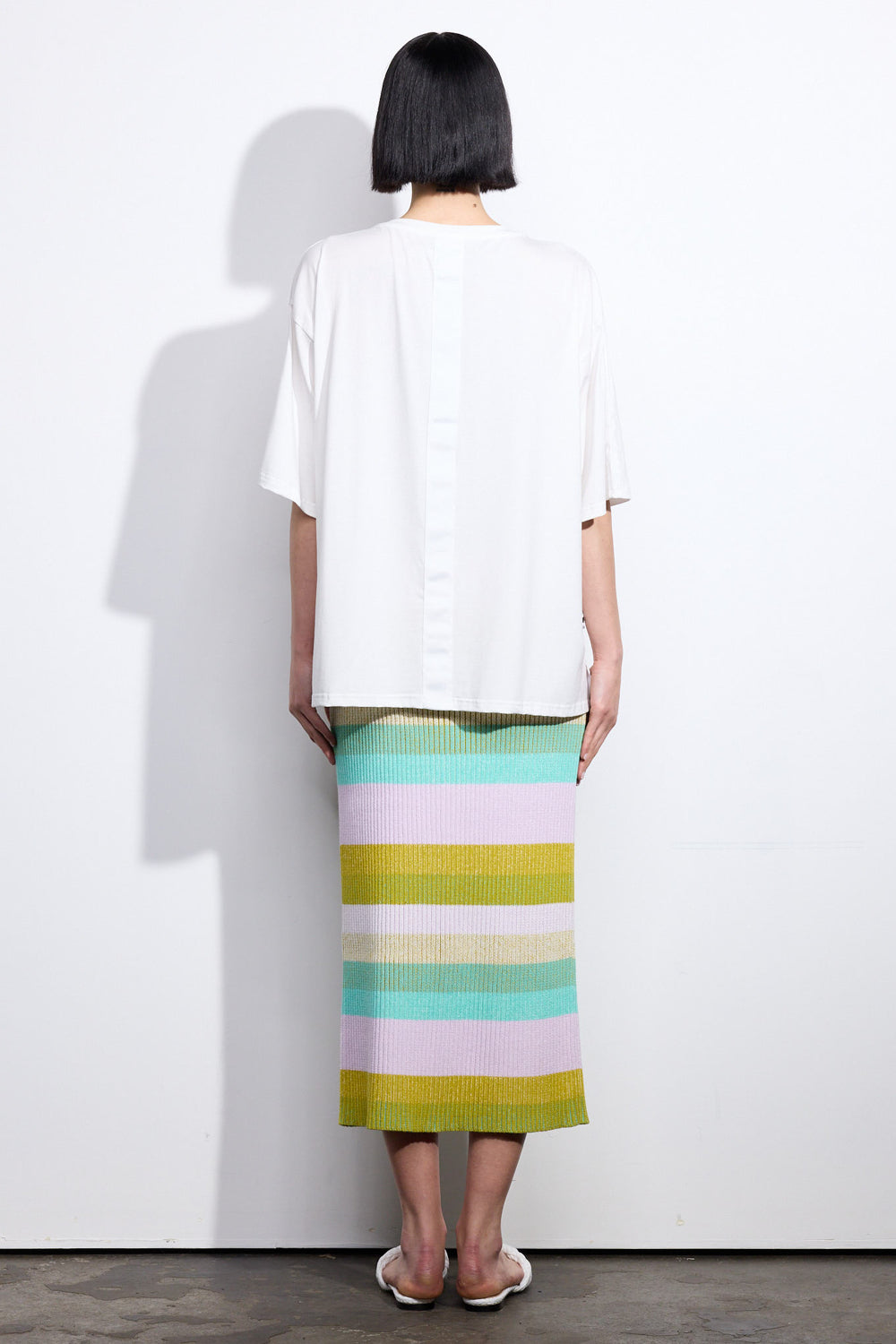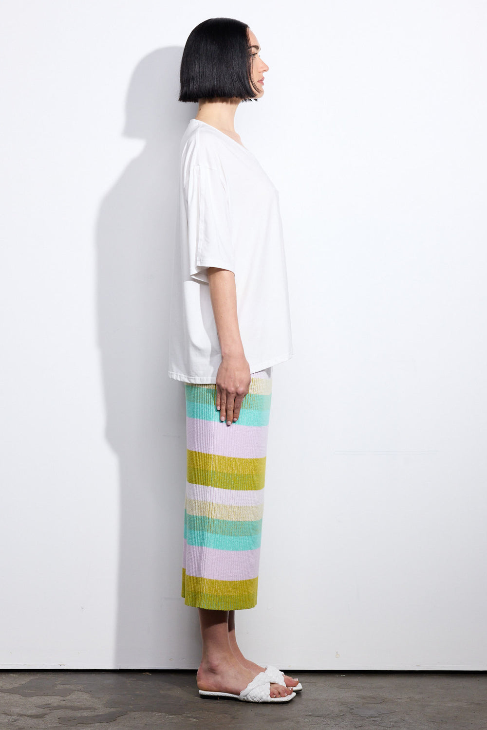 This style is a pencil cut in a mid-weight, ribbed, stretchy knit with an elastic waistband. Finished length has been crafted to fall mid-calf. We recommend buying your regular size.
