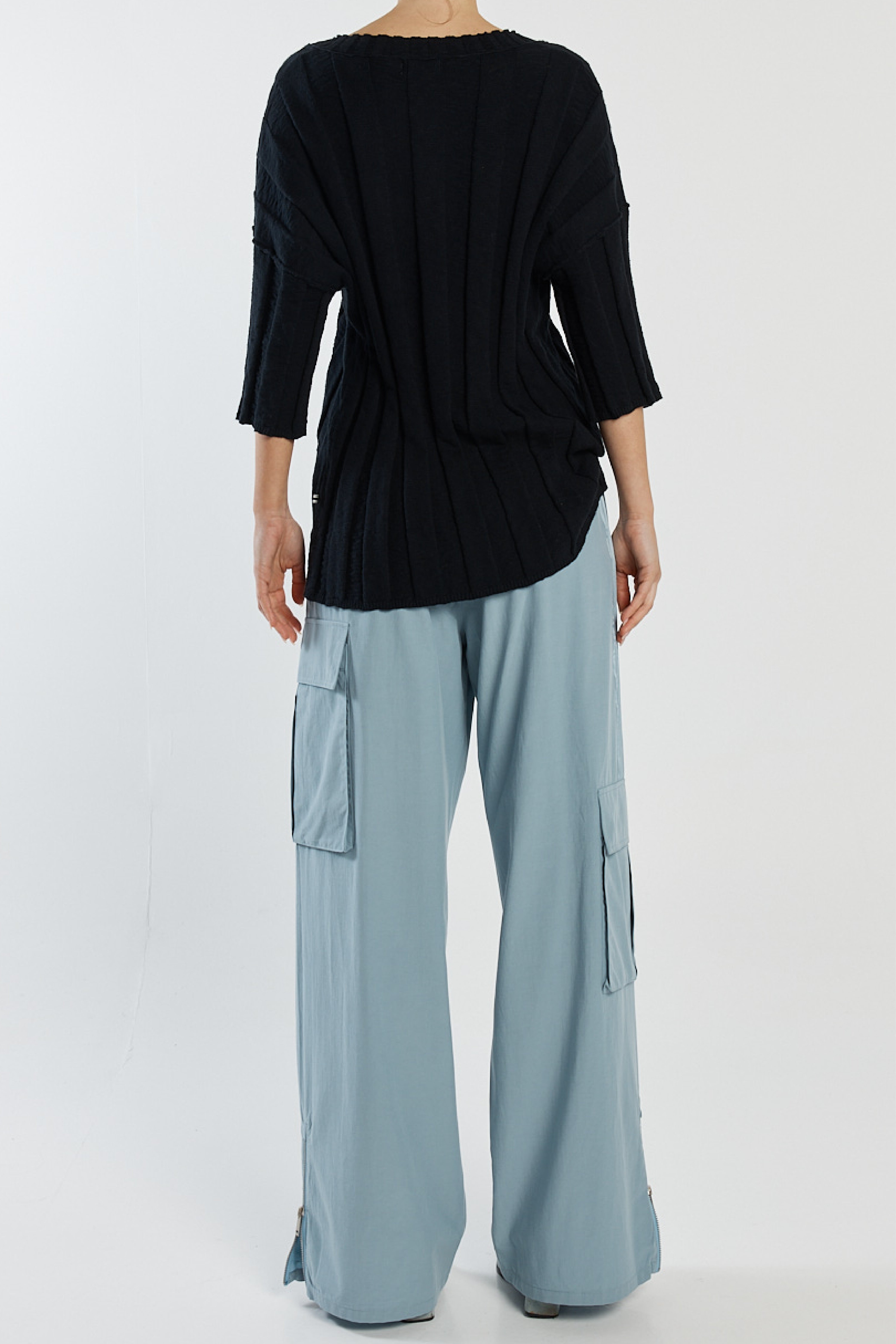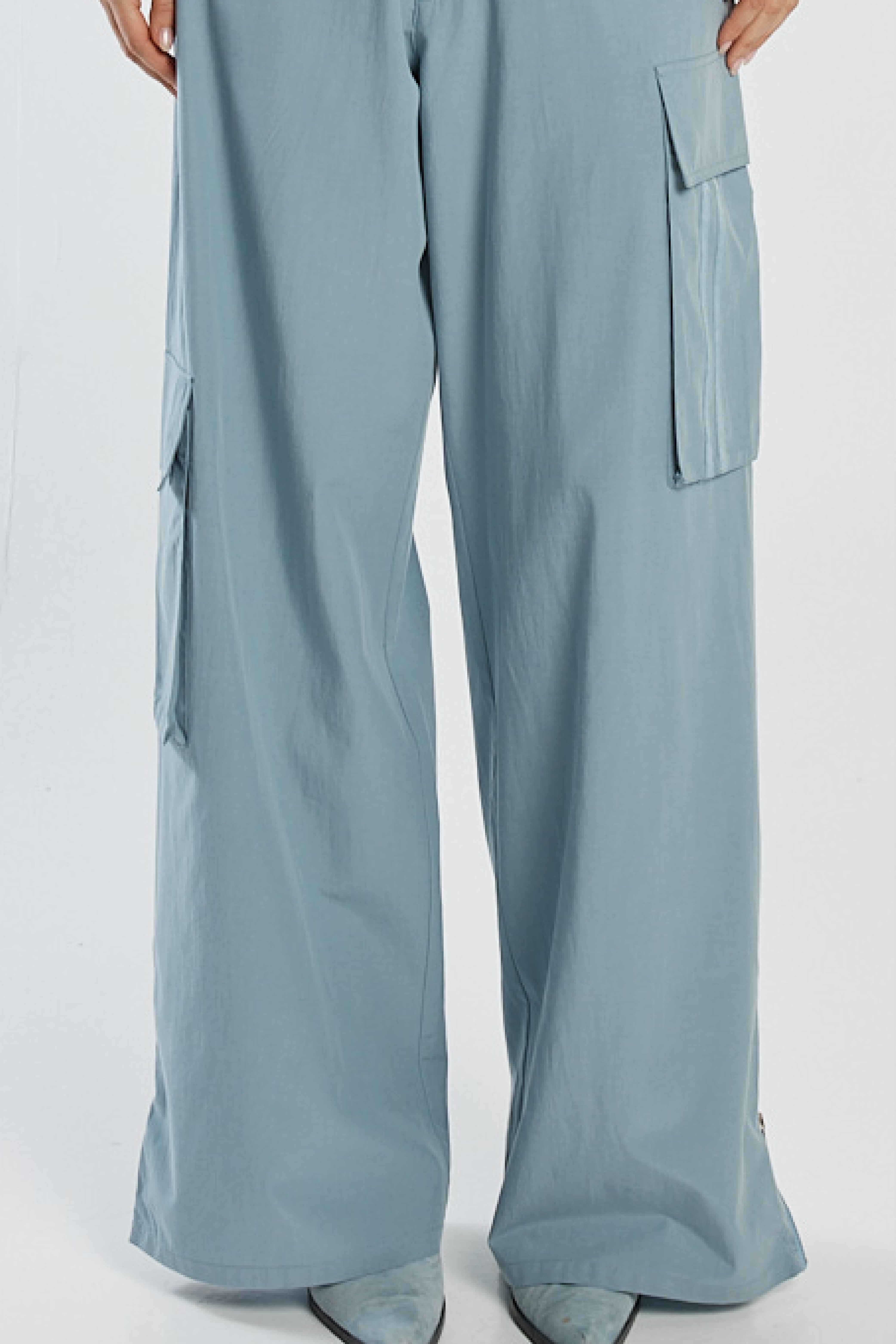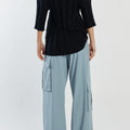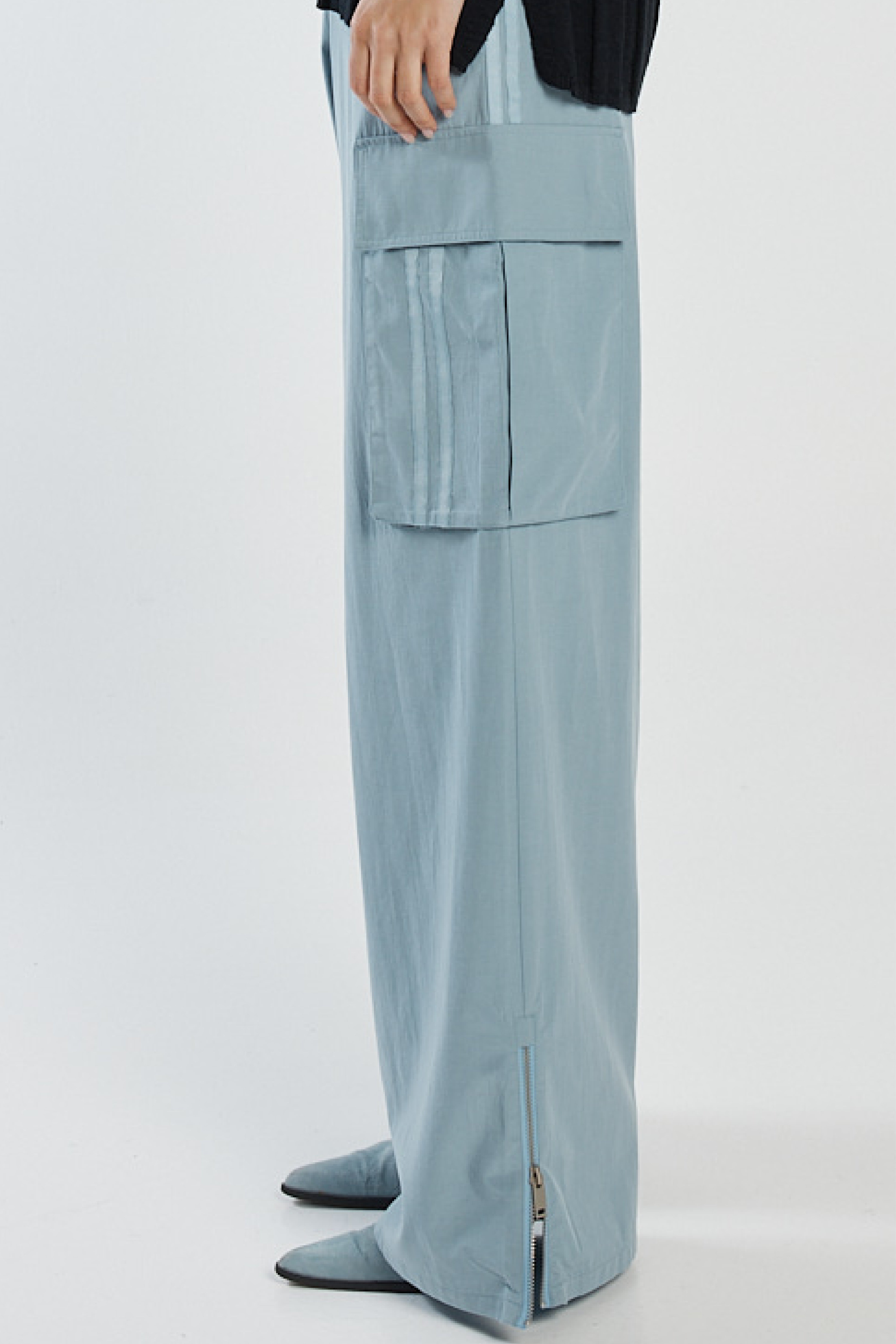 Designed with a high-rise waist and adjustable zip fastening, this style is elevated with functional cargo pockets, snap button closures, and signature grosgrain detailing. Zip accents at the cuffs nod to military influences, while side pockets ensure practicality without compromising the sleek silhouette.