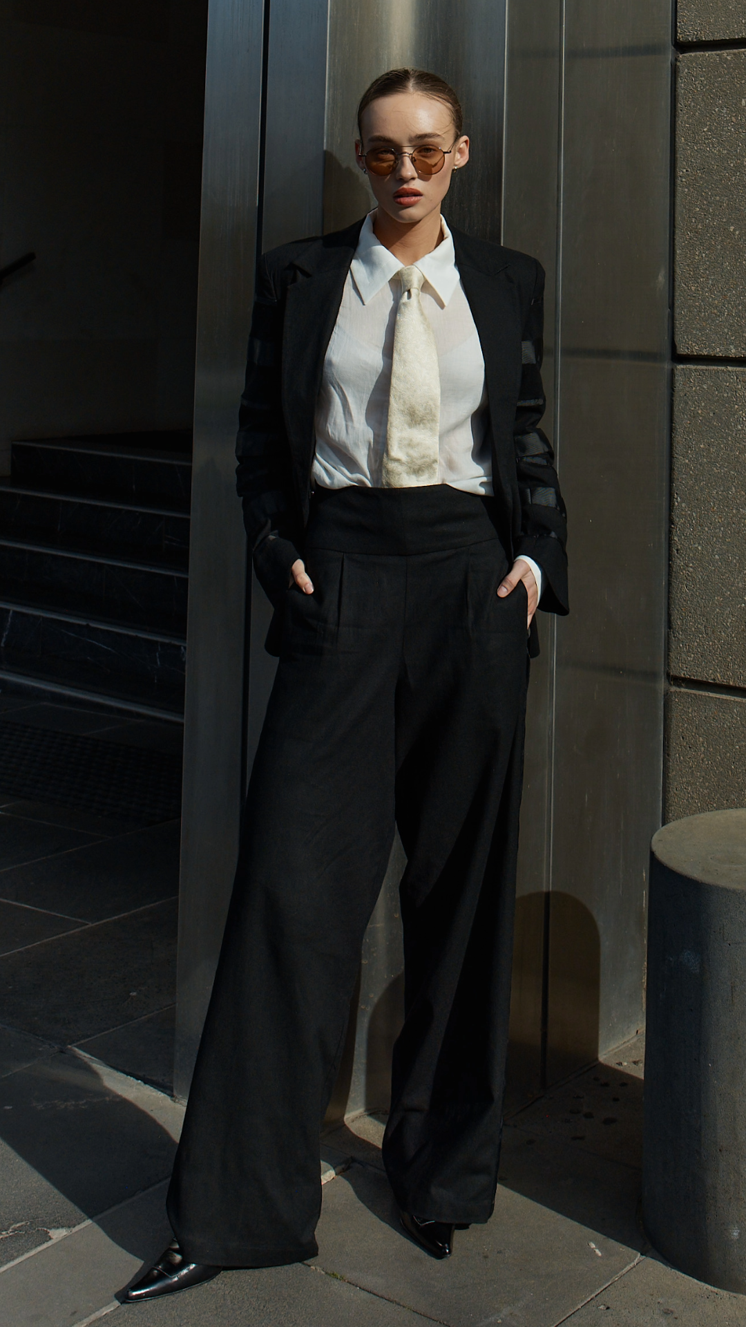 A modern interpretation of the tuxedo pant, the St Tropez Pant blends tailored sophistication with relaxed edge. Cut from a fluid linen blend, it features a high-rise waist and loose, flowing leg for effortless movement. Adjustable buckle straps at the waistband allow for a custom fit, while wide front pockets, a clean back zip, and bold grosgrain detailing add signature dref finishes. Style it with the Melbourne Bomber,  for a confident, directional look.